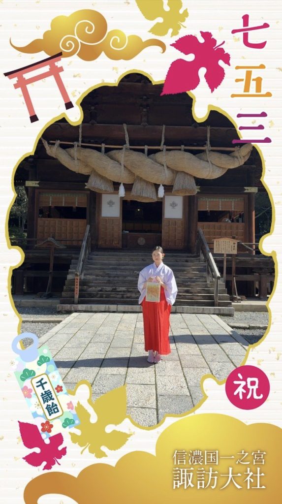 当社では、お子様が無事に成長できたことを感謝し、健やかなご成長を祈願する七五三祈祷を行なっております。 お参りの際に、お守り、千歳飴等のお下がりをお渡しします。 上社本宮、下社秋宮どちらでも受け付けております。お近くのお宮へお越しください。