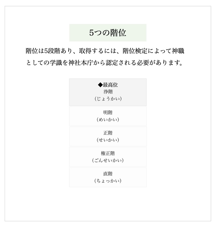 神職になるためには、「階位」という神社本庁が定める資格を取得しなければなりません。また、神道の理解を深め、神職になるための基礎的素養を身につける「神務実習」を行い、学識と実習の修了もって「階位証」が神社本庁より授与され階位資格の取得となります。