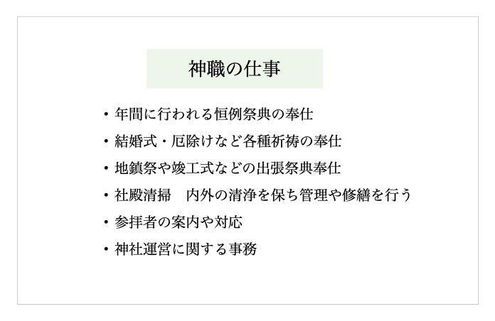 神職とは、神社で神に奉仕して祭祀や社務を行う人の総称で、神主とも呼ばれます。神道(しんとう)の教えを守り伝え、神と人々をつなぐ役割を担っています。