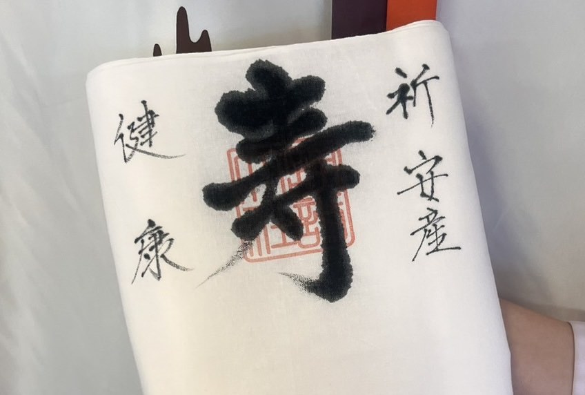 安産祈願にご自身で用意されたさらし(岩田帯)をお持ちいただければ、墨書、御朱印をして神前で祈願を込めさせていただきます。