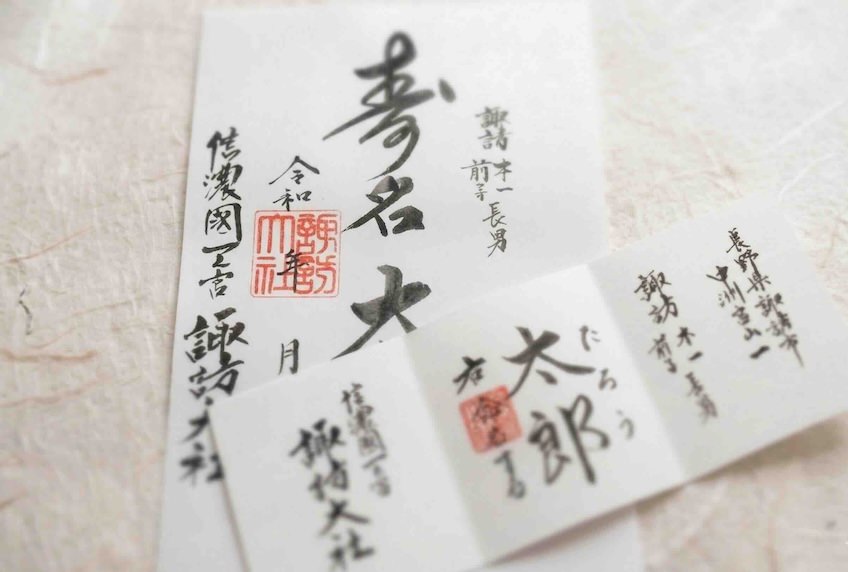 ご希望する名前、字、読みなどをお聞きしながら、諏訪大社古来の方法でお名前(複数の候補名)をお授けします。